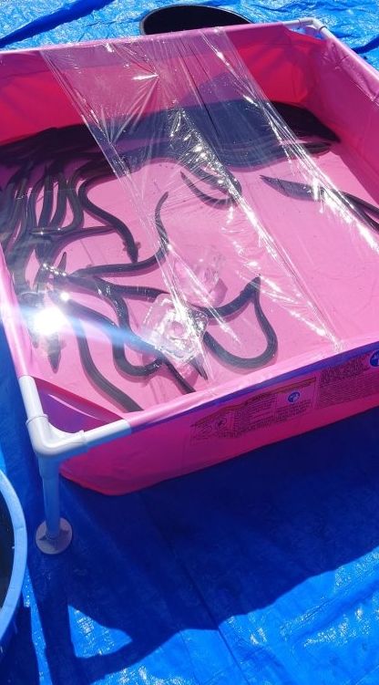 →子供用のプールを購入したので、そこに鰻を入れて捕まえてもらう感じになってます。